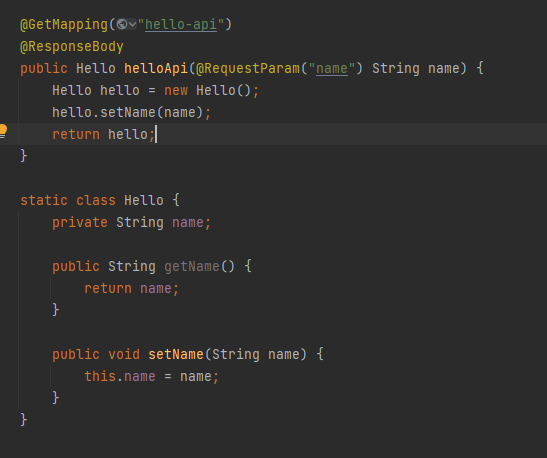 URL에서 Get 방식으로 받은 name을 Hello 객체에 대입한 후 Hello 객체를 리턴해보았다.