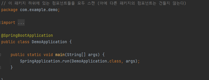 DemoApplication을 통해 스프링이 실행이 되면 하위에 있는 컴포넌트들을 모두 스캔해
