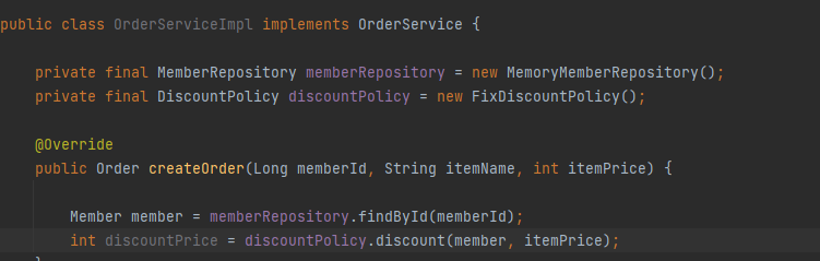 여기서 OrderServiceImpl 입장에선 할인에 대해 전혀 몰라도 됨