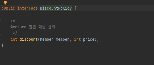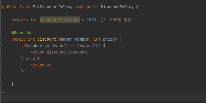 VIP는 무조건 1000원을 할인 해주는 정액 할인 정책 FixDiscountPolicy 객체가 DiscountPolicy 인터페이스에 끼워져있다.