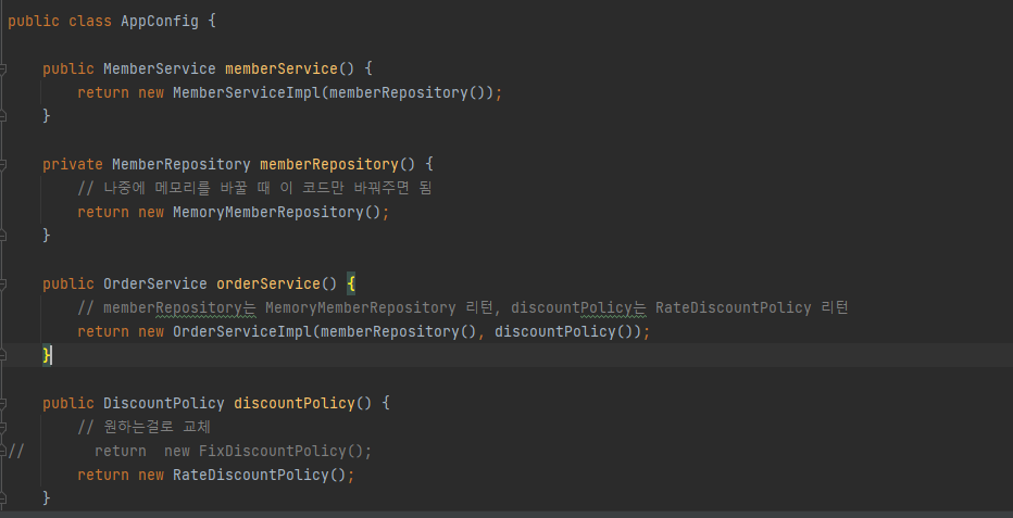 이를 해결하기 위해선 외부에서 MemoryMemberRepository와 RateDiscountPolicy를 넣어줘야하는데