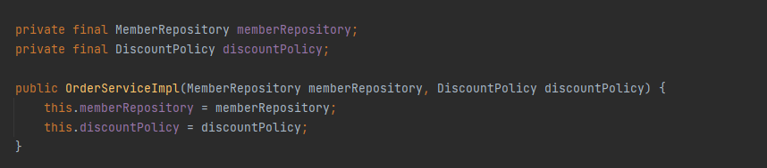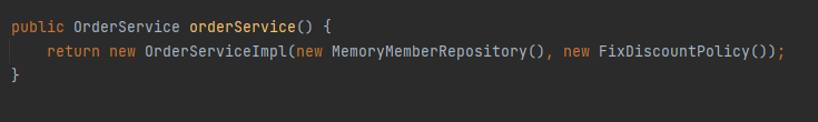 오더 서비스 구현 객체의 생성자를 통해 외부 클래스에서 생성한 객체들을 파라미터를 통해 넣어주는 로직을 만든다.