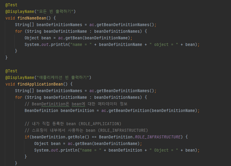 - 배열에 있는 이름을 통해 bean을 가져오고 bean의 데이터 타입을 특정할 수 없으니 최상위인 Object로 받아 출력
