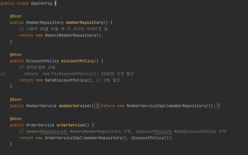 @Bean 어노테이션이 달려 있는 객체들을 등록하고 이후 각각 객체의 의존 관계를 설정해준다.