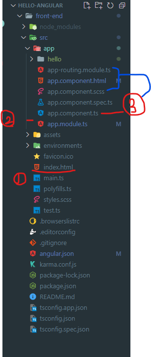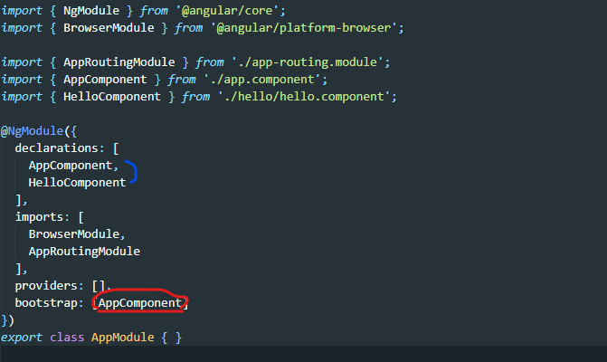 app.module.ts에 모듈로 등록되어 있는 HelloComponent의 정보를 토대로