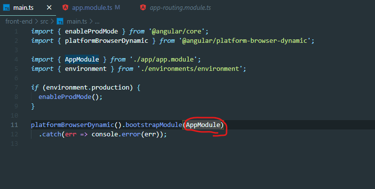 main.ts -> app.module.ts 실행 -> app.module에 등록 되어 있는 컴포넌트 app.component.ts 실행