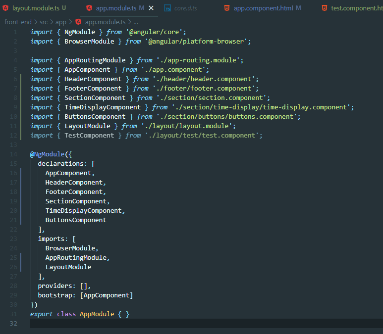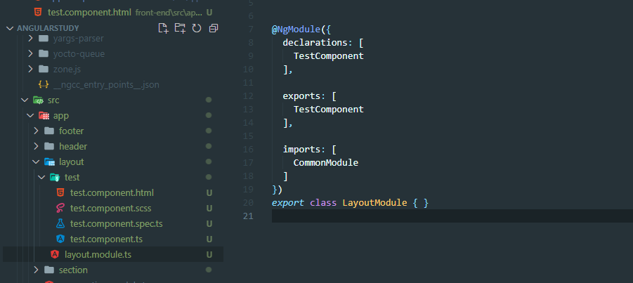 layout.module은 TestComponent를 등록해 사용하고 있고 exports: []를 통해 외부에서도 사용할 수 있도록했다.