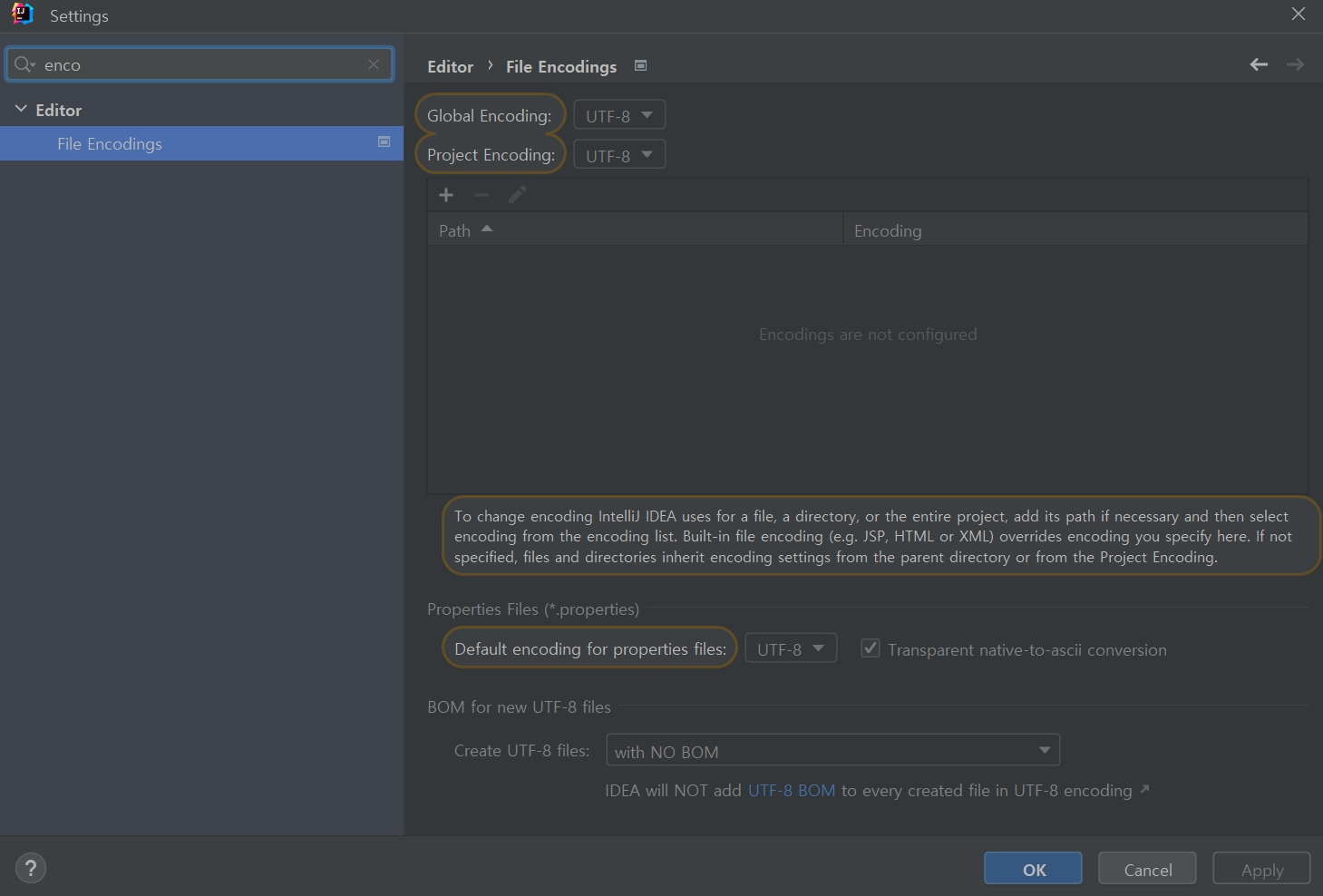 한글 깨짐 방지를 위해 인코딩은 UTF-8로 설정한다.