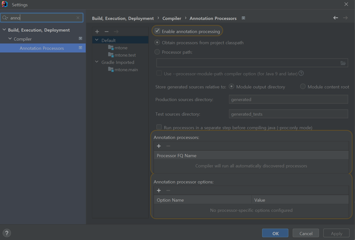 Annotation Processors를 검색 후 Enable annotation processing를 체크
