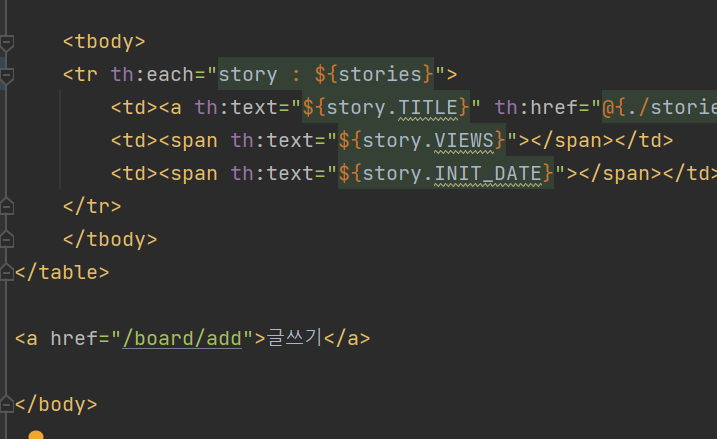 <a> 태그의 href는 GET 메소드로만 데이터를 보내므로 글쓰기 버튼을 눌렀을 때 @GetMapping 어노테이션이 달린 moveToAddForm 메소드와 매핑된다.