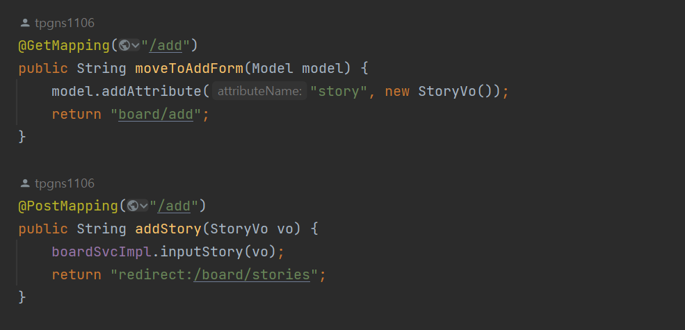 가독성을 위해 글쓰기 페이지로의 이동과 글 입력 기능을 같은 주소로 매핑하고 메소드를 통해 이를 구분한다.