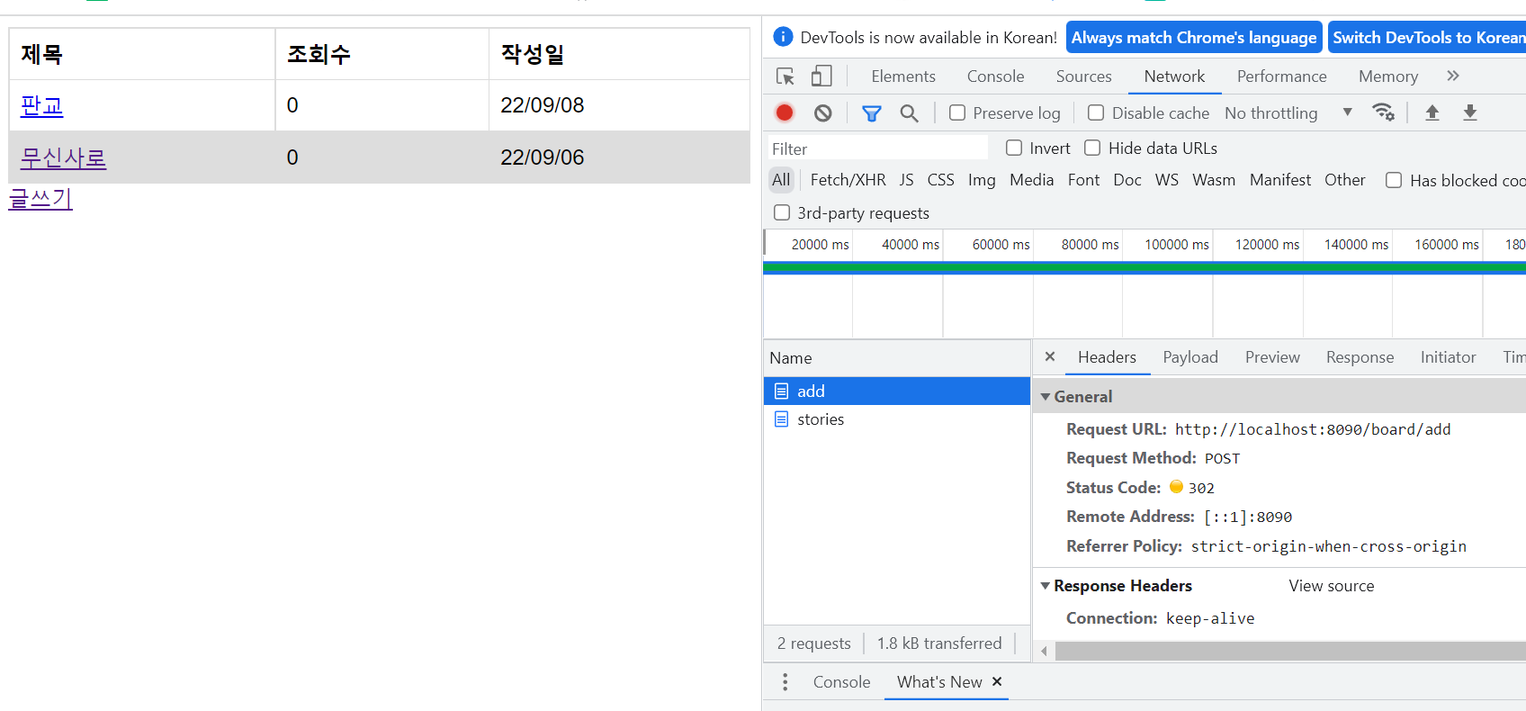리다이렉트를 통해 Status Code 302를 받았고 목록 페이지로 잘 이동한 걸 확인할 수 있다.