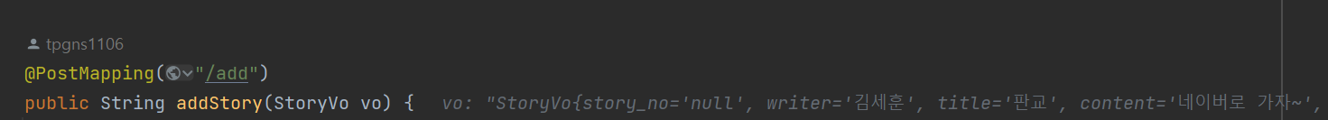 등록 버튼을 누른 뒤 Controller에서 디버깅을 찍어보면 form 데이터가 vo에 잘 들어간 것을 확인할 수 있다.